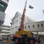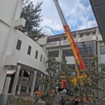周囲を建物に囲まれた環境のため、ラフタークレーンを使用し、安全を最優先に作業を実施しております。